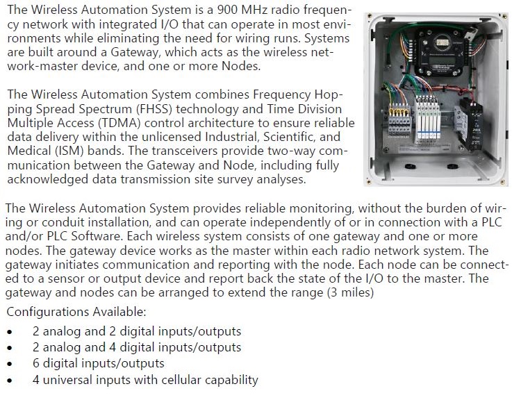 Wireless supervised Two-Way Network Applications: Industrial Automation, control, monitoring Performance 2 Miles ( 3 km ) Optional extended range up to 10 Miles (16Km)